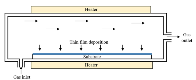 1.Prekurzory reakcie sa dodávajú do reakčnej komory nosným plynom. Pred dosiahnutím substrátu môžu reakčné plyny prejsť homogénnymi reakciami v plynnej fáze v hlavnom prúde plynu, pričom sa generujú niektoré medziprodukty a zhluky.