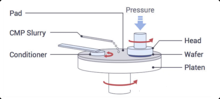 Chemické mechanické leštenie (CMP), ktoré kombinuje chemickú koróziu a mechanické leštenie na odstránenie povrchových nedokonalostí, je významným polovodičovým procesom na dosiahnutie celkovej planarizácieoblátkapovrch. CMP vedie k dvom povrchovým defektom, skrúteniu a erózii, ktoré významne ovplyvňujú rovinnosť a elektrický výkon prepojovacích štruktúr.