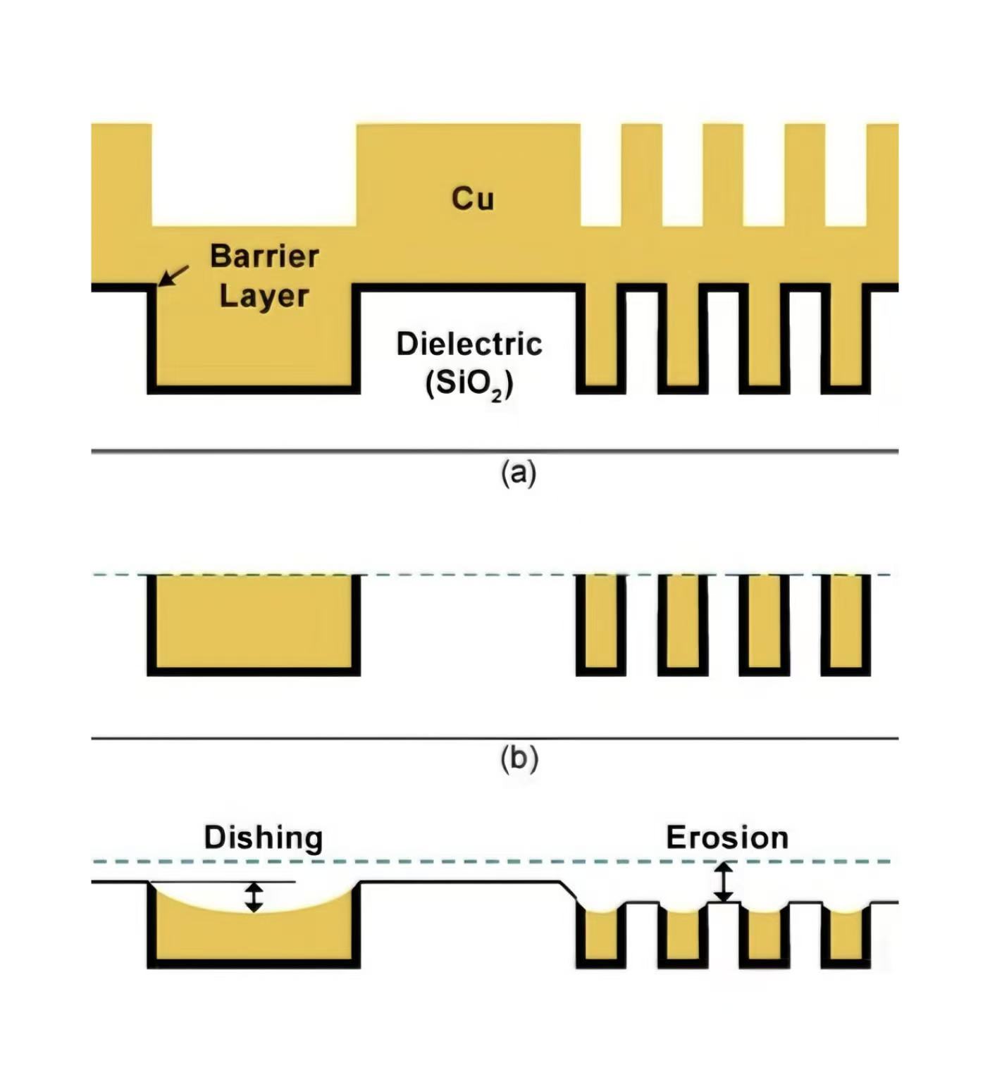 Ryhovanie znamená nadmerné leštenie mäkších materiálov (ako je meď) počas procesu CMP, čo vedie k lokalizovaným stredovým priehlbinám v tvare disku. Tento jav, ktorý je bežný v širokých kovových líniách alebo veľkých kovových plochách, pramení predovšetkým z nekonzistentnosti tvrdosti materiálu a nerovnomerného rozloženia mechanického tlaku. Dishing je primárne charakterizovaný priehlbinou v strede jednej, širokej kovovej línie, pričom hĺbka priehlbiny sa zvyčajne zvyšuje so šírkou čiary.