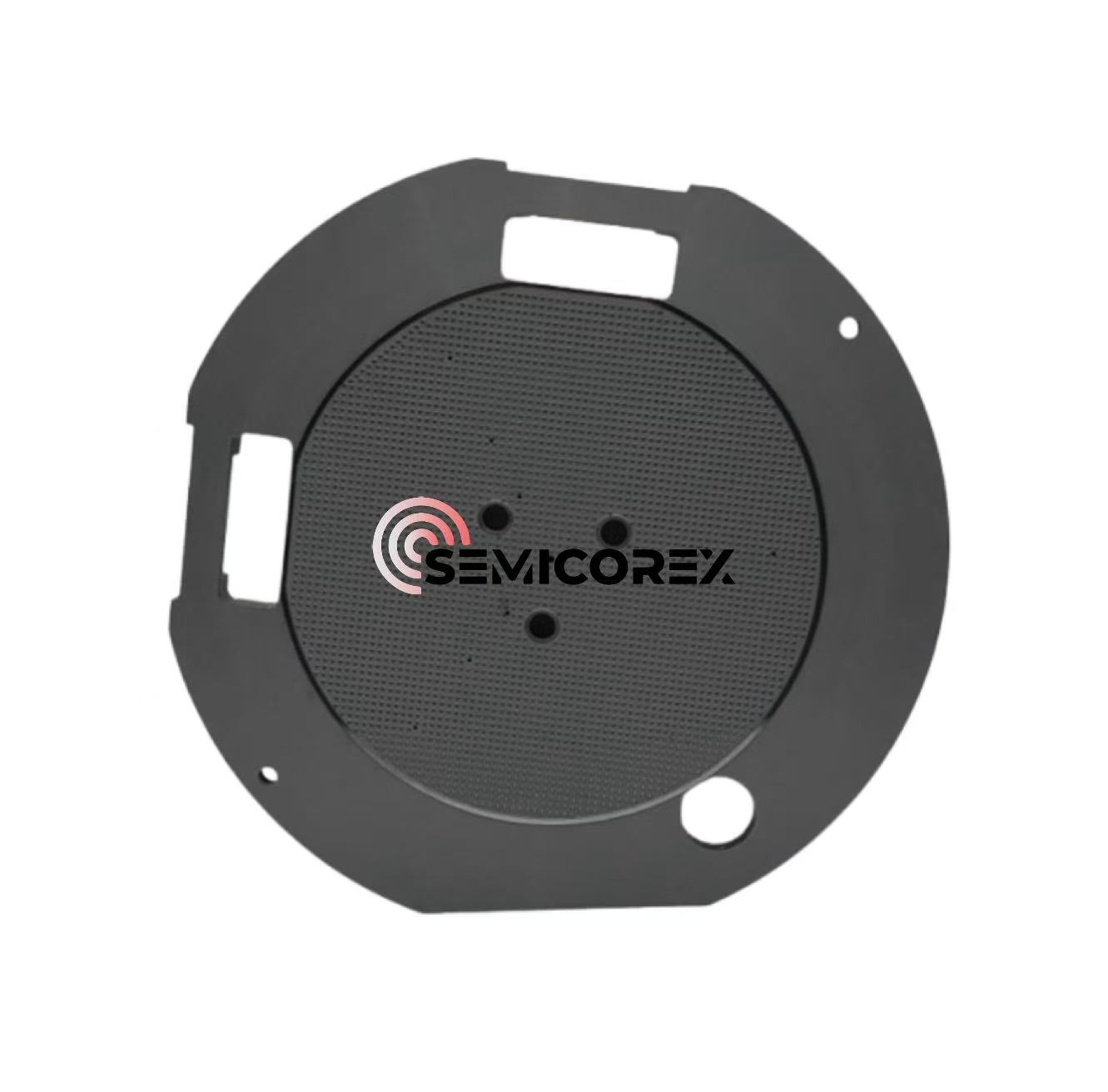 Presne skonštruované mikrootvory sú rovnomerne rozmiestnené po povrchu keramických vákuových skľučovadiel SiC, čo umožňuje spoľahlivé pripojenie k externému vákuovému zariadeniu. Počas prevádzky sa vákuová pumpa aktivuje, aby nasala vzduch cez otvory, čím sa medzi polovodičovým plátkom a vákuovým skľučovadlom vytvorí podtlakové prostredie. To preto umožňuje rovnomerné a pevné držanie plátku na povrchu vákuového skľučovadla.